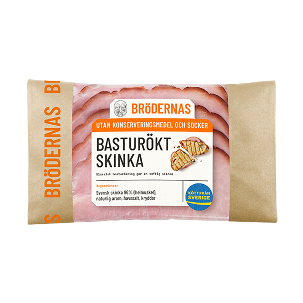 Brödernas basturökta skinka är rökt på klassiskt vis för en saftigare skinka. Utan konserveringsmedel och socker. Gjord på svenskt kött.