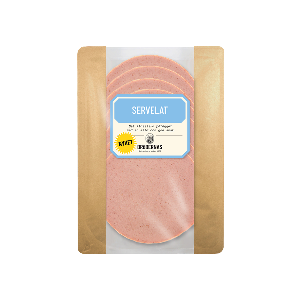 Brödernas Servelat är det klassiska pålägget med en mild och god smak. Kokt på traditionellt sätt som ger et saftig och smakrik pålägg som passar hela familjen, stora som små.