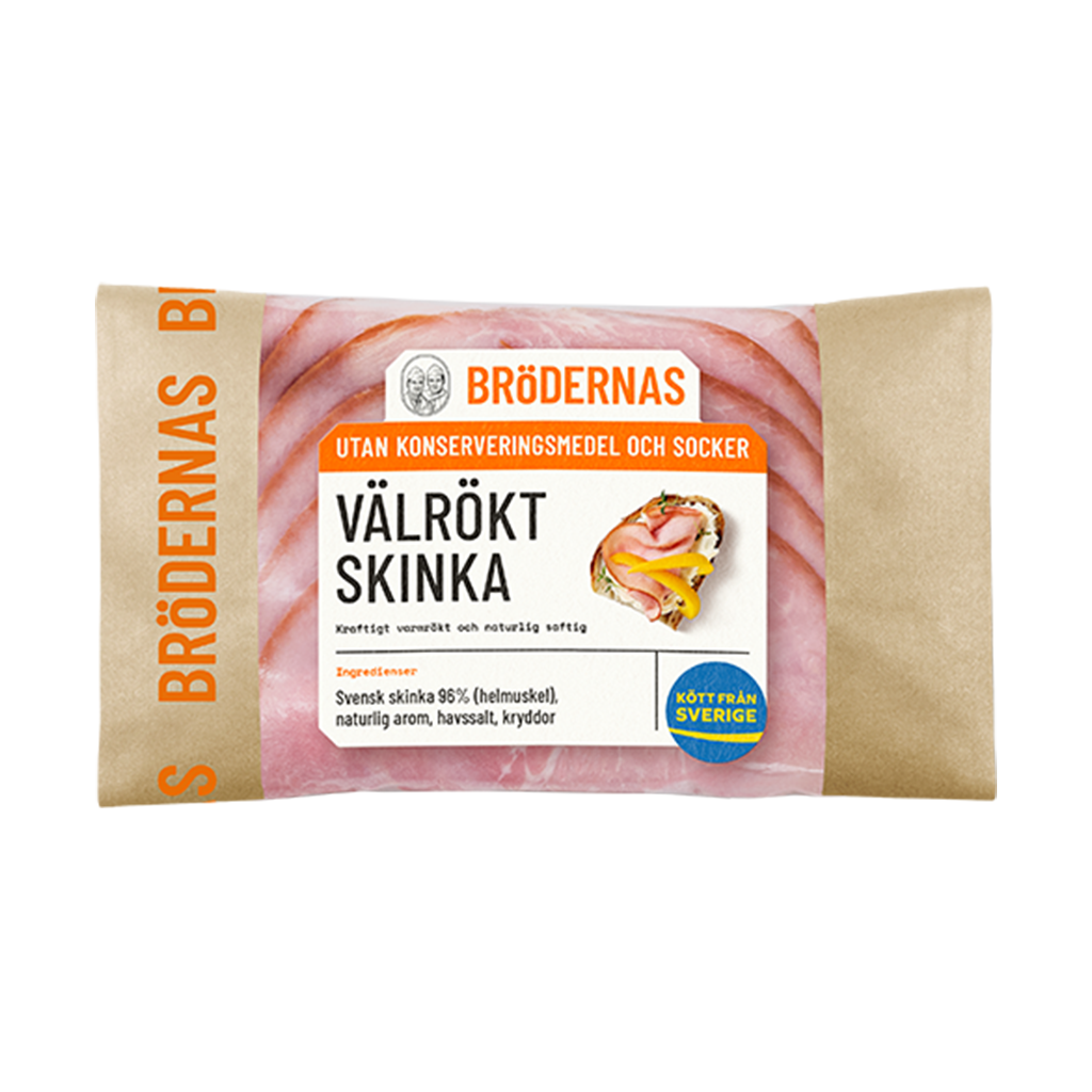Brödernas Välrökta skinka är kraftigt varmrökt och naturligt saftig. Utan konserveringsmedel och socker. Gjord på svenskt kött.
